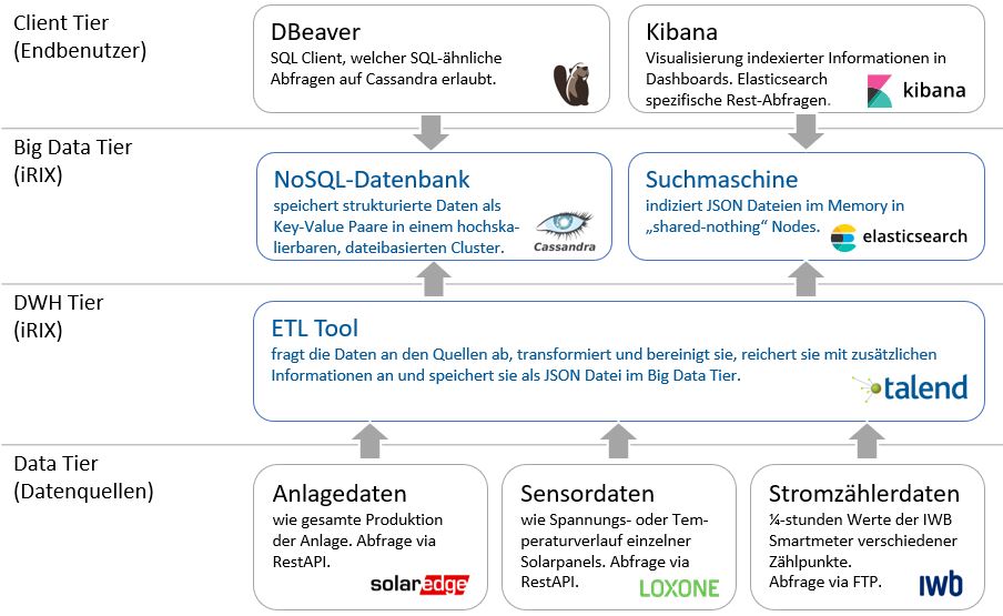 iRIX wurde mit dem Monitoring der Anlage und der Bereitstellung einer Auswertungsplattform für die Projektteilnehmer beauftragt. Erfasst werden sollen die Energie- und Leistungsdaten der PV-Anlage, des Speichers, aller Verbraucher, sowie die Einspeisung und der Bezug aus dem Stromnetz. Die Daten der verschiedenfarbigen Module sollen einzeln erhoben werden. So kann die Leistungsminderung aufgrund der Kolorierung exakt aufgeführt und mit den Herstellerangaben verglichen werden. Durch das Monitoring soll der Stromspeicher optimiert und der externe Strombezug reduziert werden. Die verschiedenen Daten sollen zur Vereinfachung der Auswertung auf einer Plattform zusammengeführt werden.